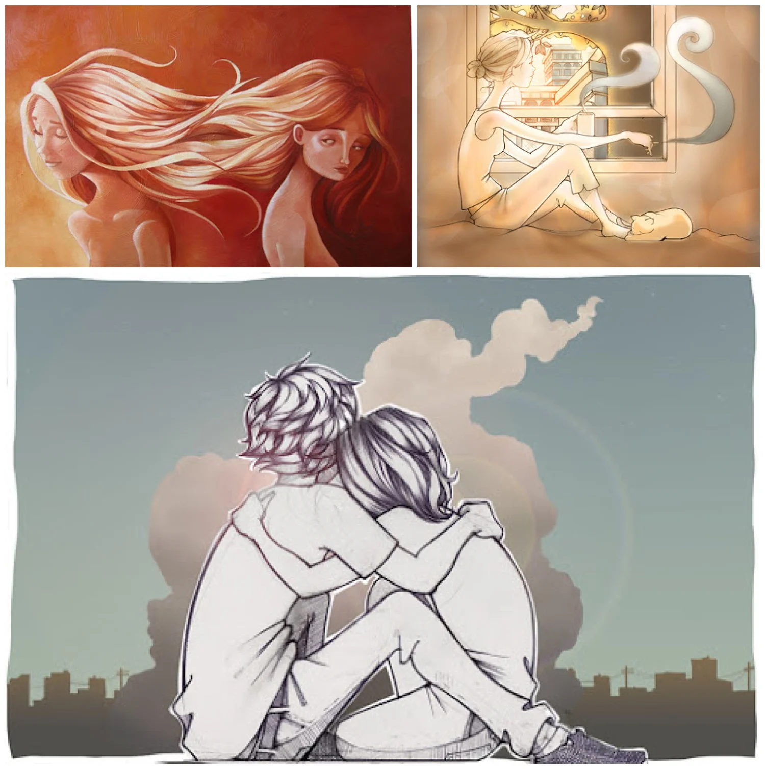 I love crumbling brick buildings. I love wrists… and the way fingers bend. I love cigarette smoke (how it looks, not smells) and I love that time of night when it’s not quite dark yet and the sky is a perfect brilliant blue and all the windows of the houses are already lit up and glowing warm yellow. I love women. And flowing lines. And plants.