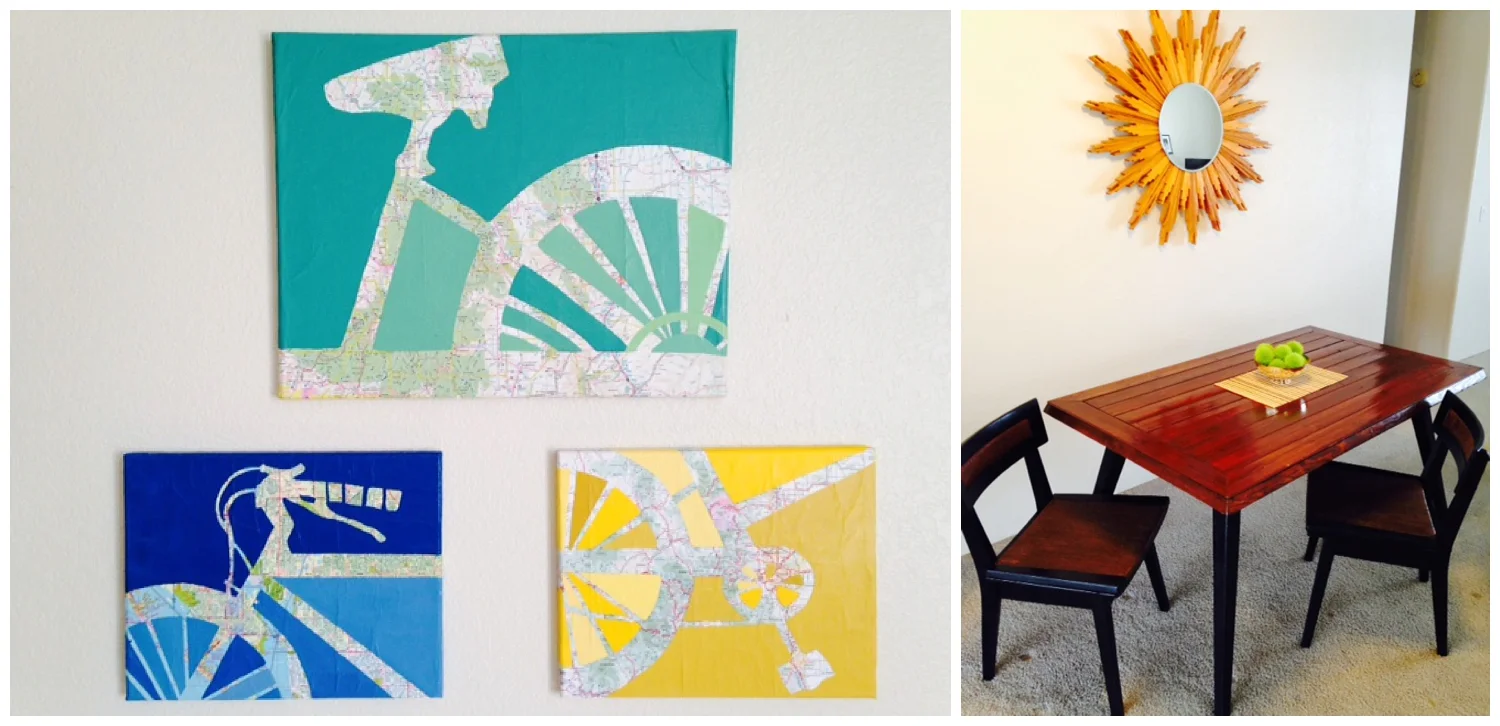 (LEFT) BICYCLE PRINTS ON OLD MAPS, (RIGHT) REPURPOSED MIRROR, COFFEE TABLE AND REFINISHED CHAIRS. ALL FOUND ON DIFFERENT TRIPS TO THE SALVATION ARMY