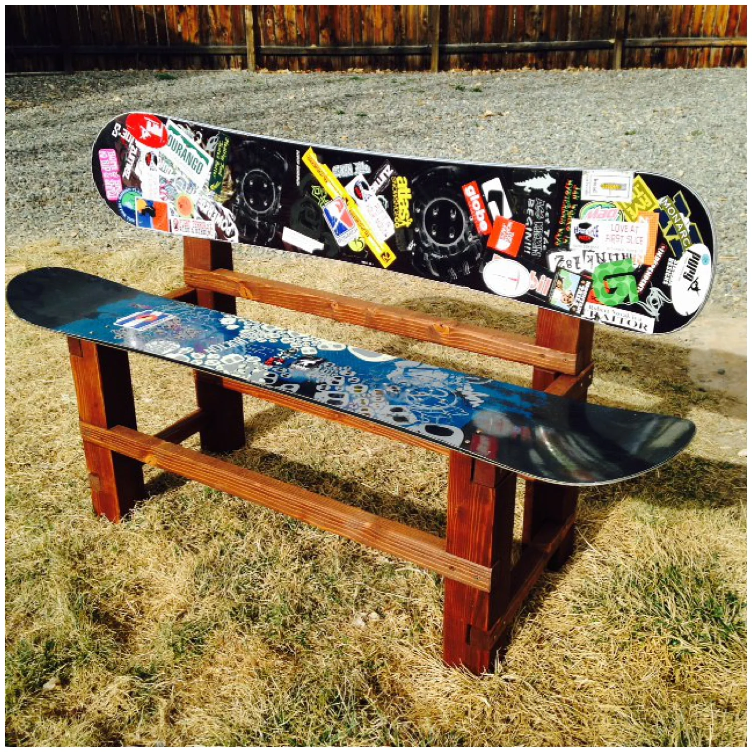 Bench made out of repurposed snowboards