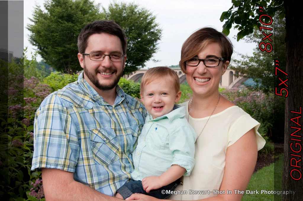 Playing it Safe Take this first photo of a portrait of a family. You can see the original image, the image if it were to be printed as a 5x7” print as well as if it were printed as an 8x10”. You can see that I left enough space around the family so that I did not crop into their faces or bodies.